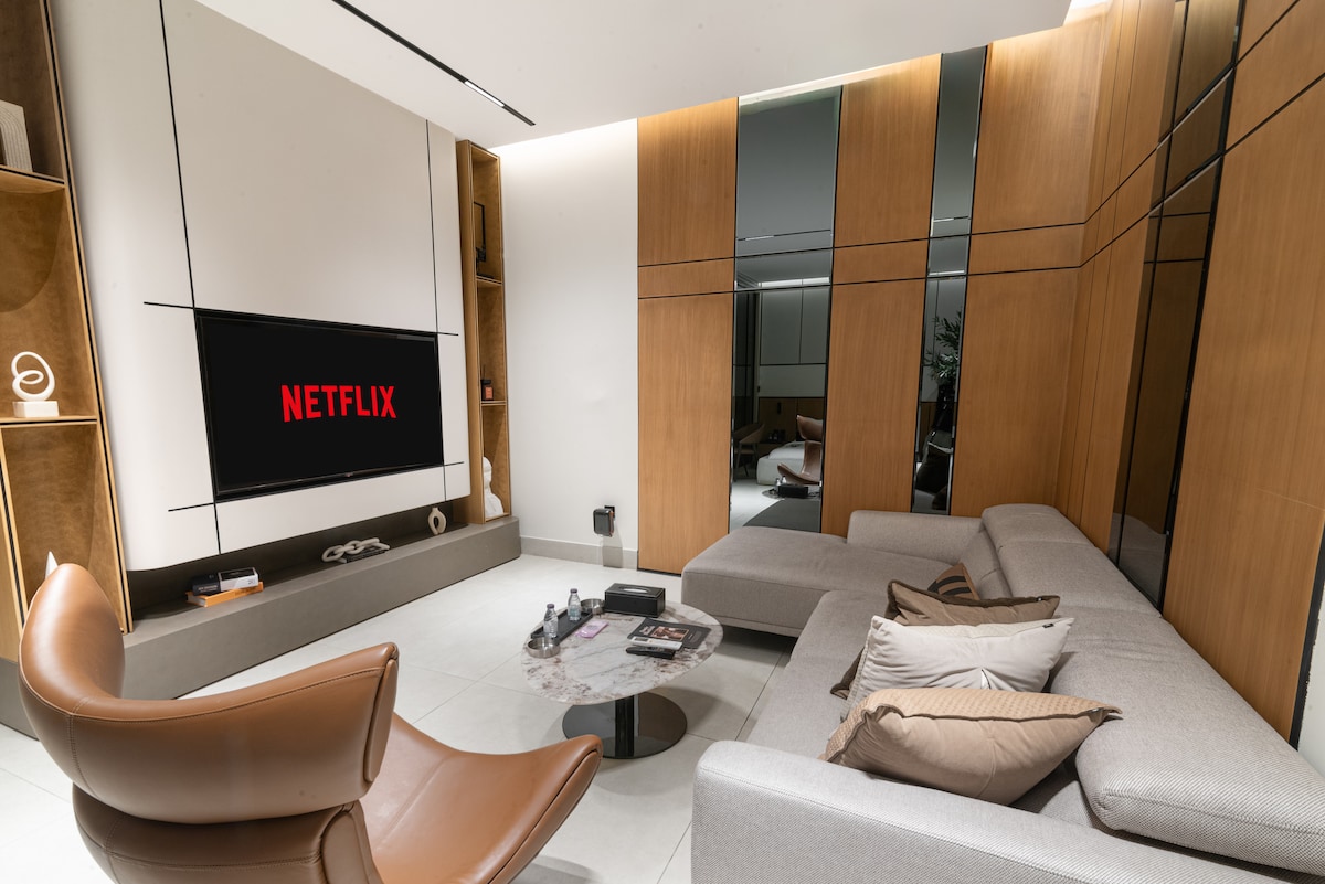 Faigh blaiseadh d'eispéireas uathúil i Stiúideo príobháideach d'Ealaíontóirí a thairgeann scíth agus compord. Cuimsíonn an stiúideo leaba agus áit suí taobh inar féidir leat taitneamh a bhaint as a bheith ag breathnú ar Scáileán cliste 65 orlach. Tá cistinéad agus caife ar leith ann freisin chun freastal ar do riachtanais go léir agus ar d'áit ghalánta lasmuigh ina bhfuil poll dóiteáin. tá an suíomh gar do gach seirbhís, don cheann scríbe turasóireachta, agus do cheantair Shéasúr Riyadh (Boulevard,Arena,Etc) laistigh de 5 nóiméad. Ba bhreá linn tú a óstáil agus an t - eispéireas a roinnt linn!