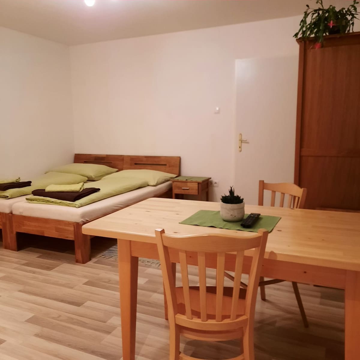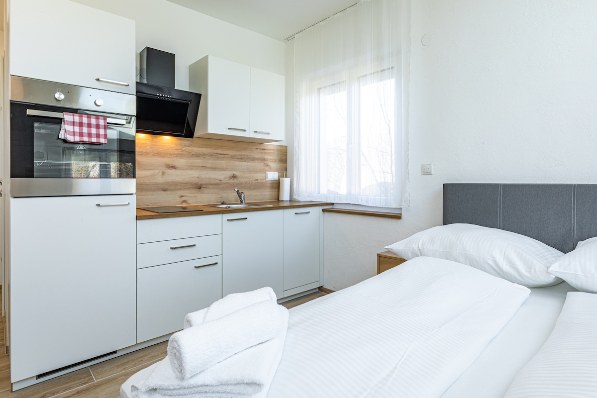 Árasán 1 seomra le balcóin agus páirceáil saor in aisce i spás páirceála tiomnaithe díreach in aice leis an teach. Maol 30m2 le radharc ar an Ostair agus luí na gréine Ceadaítear ainmhithe freisin. Áiseanna Árasáin: - 2x tuáille mór agus 2x tuáille beag - Glóthach chithfholcadáin, seampú - táirgí glantacháin - caife, tae Tá an t - árasán suite ag tús Cheantar Chathair na Bratasláive, Záhorská Bystrica. Tá infhaighteacht 2 nóiméad siúil ó stad bus (Krče), 20 nóiméad. ar an mbus ón stáisiún lárnach, 15 nóiméad. i gcarr