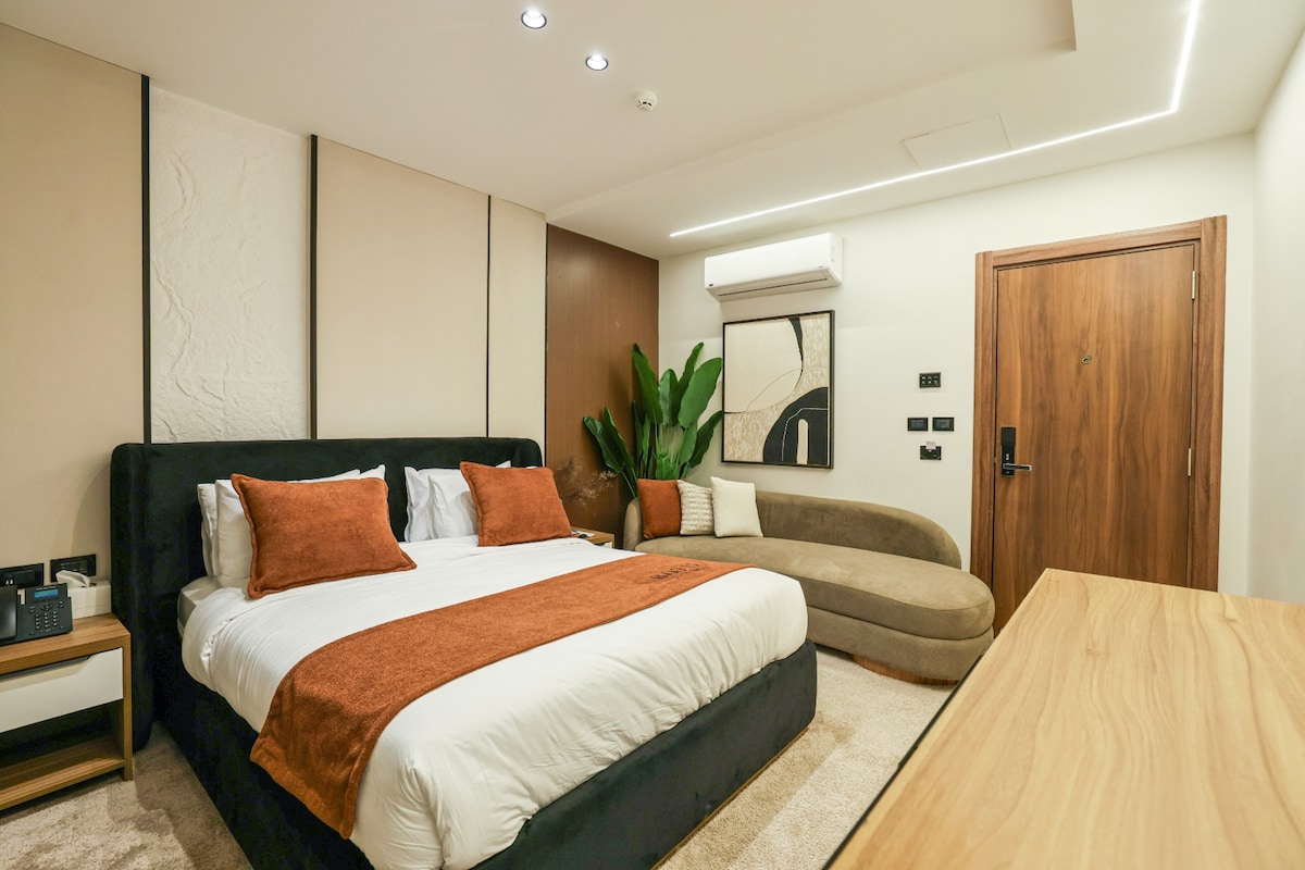 A royal studio designed as a mini apartment, featuring an elegant open layout with a cozy living area, a comfortable sleeping space, and upscale finishes for a luxurious stay.