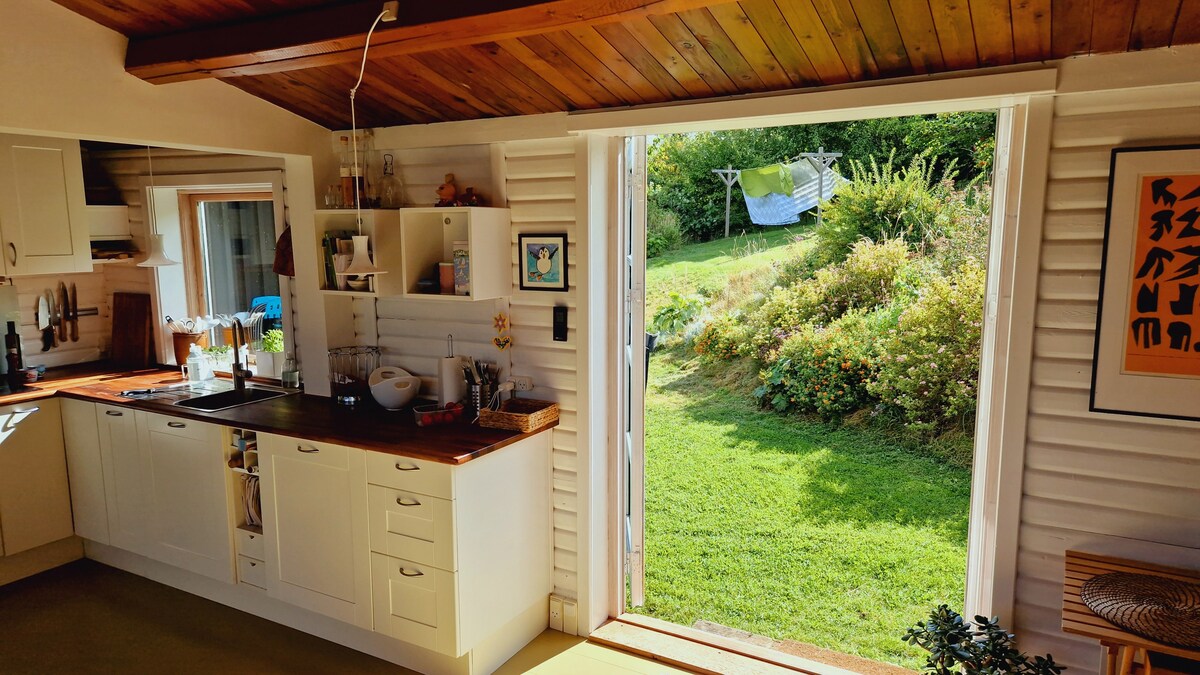 Teachín Nordach. Farraige, sorn dóite adhmaid & folcadán san fhásach