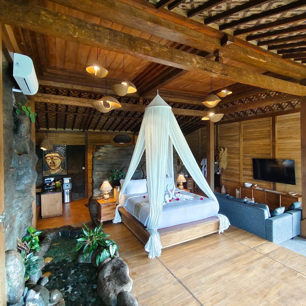 Faigh blaiseadh de Bali ó radharc ar shúil na n - éan in The Avana Treehouse Bambú Villa. Tá an t - eispéireas villa bambú aon uaire seo suite 15 mhéadar ar airde i measc na gcrann clóbh ar imeall aille. Má bhaineann tú taitneamh as an radharc ó aon cheann de na háiteanna 3 stór, beidh tú ar do shuaimhneas agus leis an extraord tá tú ar snámh san aer. Anseo thíos tá an Teach Crainn ar Snámh ina bhfuil páirceanna rís fairsinge méithe ar feadh Abhainn Ayung a bhuaileann leis na sléibhte. Is féidir leat Bolcán Mount Agung a fheiceáil ar thaobh na láimhe clé agus ar an Aigéan Indiach ar dheis.
