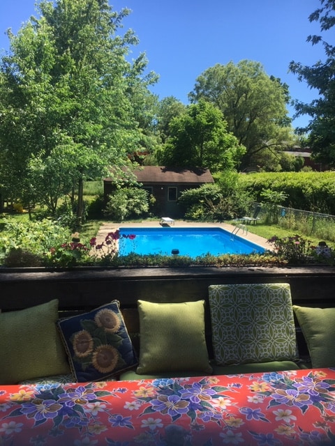 Teach fairsing, síochánta ag breathnú amach ar Cayuga Lake