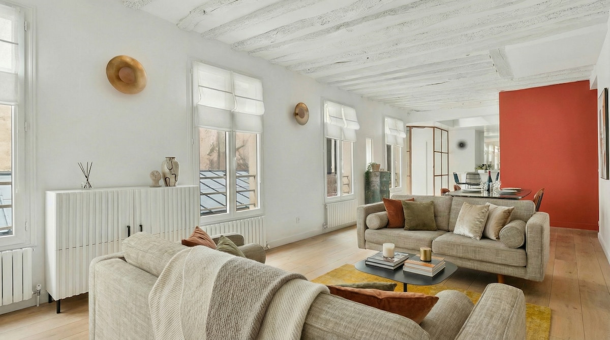 Árasán aerchóirithe de 60 m2 le leagan amach uas - scála i lár cheantar stairiúil Pháras in Montorgueil, a bhfuil clú agus cáil air mar gheall ar a shiopaí bia, bistros beaga agus bialanna. Tá an t - árasán suite ar urlár 1 ú foirgneamh ar shráid an - chiúin. Rinne ailtire cáiliúil é a athchóiriú in 2023 agus dá bhrí sin bhí sé eagraithe go han - mhaith le saoráidí caighdeánacha an - ard. Beidh tú ann mar atá i svuít óstáin leis an charm ina theannta sin, lóistín fíor - Pháras.