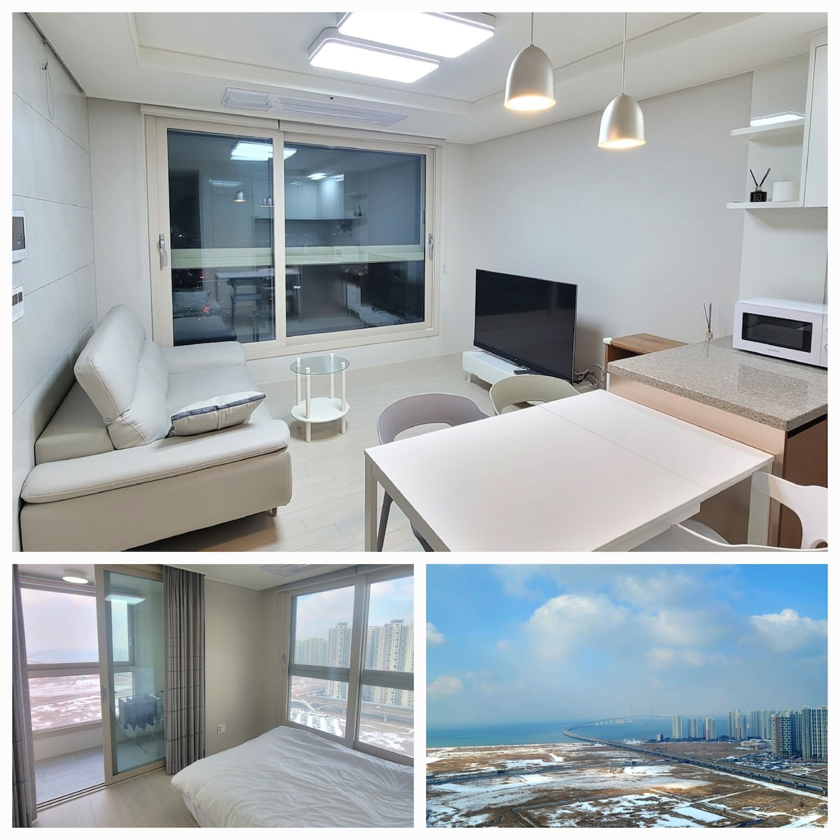 The way to the airport(공항가는 길) 선셋과 오션뷰가 잘 어우러진 아름다운 곳입니다. 달빛에 비친 밤바다와 잔잔한 음악과 함께.. 숙소 안에서 그 감성을 느껴보세요. ✔시설 안내✔ ✔50인치 4k스마트 TV + 야마하 사운드바 -넷플릭스, 디즈니 플러스, 왓챠, 쿠팡플레이, 멜론 ✔전기포트, 전자레인지, 냉장고, 토스터기 ✔수저 및 식기류, 와인잔/ 오프너, 소주잔 ✔비데, 드라이기 , 롤빗 , 리무버 ✔샴푸, 린스 , 바디워시, 손소독제, 치약 ✔컵라면, 티백, 과자 ✔알러지케어 침구류 *수건과 침구류는 항상 세탁하여 준비* ✔위치✔ -영종도 구읍뱃터 -건물 내 무료주차 가능 -건물 내 1층 편의점 -배타고 15분 내로 월미도 도착 -뱃터 옆 수산물센터 위치 *호텔내 취사불가* 같은 건물 내 호실 대비 4제곱미터 한평이상 큰룸입니다 (비교해보시면 훨씬 넓어요) 체크인과 체크아웃은 모두 비대면으로 진행합니다