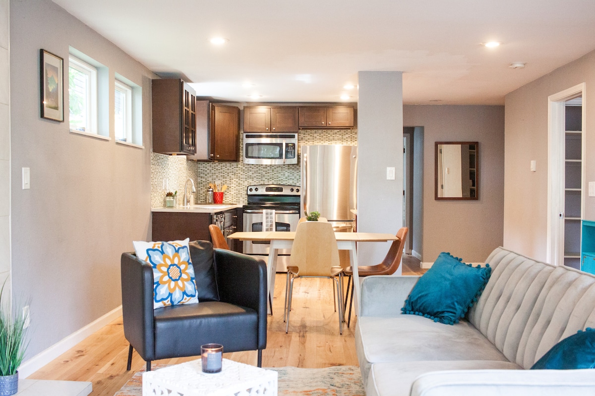Suíomh iontach! Is árasán íoslaigh nua - aimseartha é seo. Tá seomra leapa príobháideach ann ina bhfuil leaba na Banríona agus cuirtíní dúghorma. Folcadán iomlán, Seomra Maireachtála le teilifís, Tolg, Deasc, Cuisneoir, Doirteal, Oigheann Tóstaer, Micreathonnán, aonad Keurig & AC. Siúl síos an alán le haghaidh radhairc áille uisce/luí gréine ón bpáirc nó suas an tsráid chuig bialanna/siopaí. * Idirlíon Tapa *1200mbps *Áit phaitió * Bealach isteach príobháideach *D'áit pháirceála féin sa chabhsa. *Rochtain éasca ar bhus laistigh d'achar siúil. *1 mhíle f/críochfort cúrsála