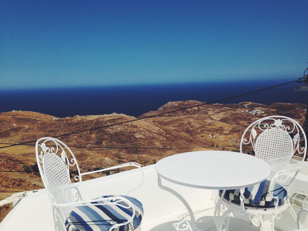 Is seanteach beag dhá leibhéal é mo theach agus rinneadh athchóiriú ar ailtireacht thraidisiúnta na Ciocláidéise le linn 2019, agus é dingthe in alleys sheanchathair oileán Serifos atá caomhnaithe go maith, darb ainm Chora. Mar gheall ar a thopagrafaíocht agus ar líonra casta na n - ailltreacha cúnga, ní cheadaítear aon fheithiclí ach miúileanna. Fágann sé seo gur suíomh iontach é d'aíonna a bhfuil meas acu ar shimplíocht agus ar bharántúlacht, in éineacht le ciúineas agus radharc lánléargais iontach ar an bhfarraige Aeigéach, amach ó chalafort torannach Livadi.