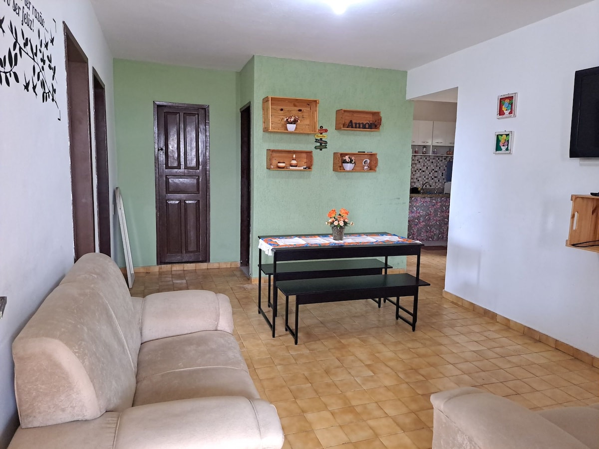 Tabhair an teaghlach ar fad chuig an áit iontach seo ina bhfuil go leor spáis chun spraoi a bheith agat. Teach compordach, thart ar 120m2. Tá balcóin mhór ann. Áit bheárbaiciú le beárbaiciú agus páirc peile le haghaidh fóillíochta Cistin ina bhfuil caibinéid agus gach uirlis, micreathonnán agus cuisneoir. Maidir leis na laethanta is teo, tá gaothráin sna seomraí codlata. Suite 50 méadar ó Marbella/ Nova Almeida - trá Serra.