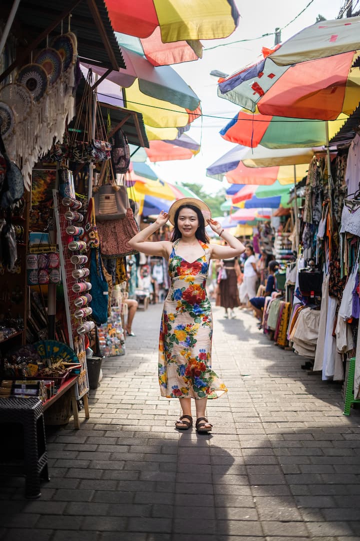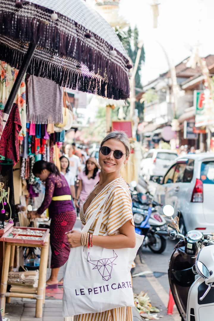 Téigh ar shiúlóid threoraithe trí shráideanna agus margaí bríomhara Ubud, ag gabháil cuimhní speisialta.