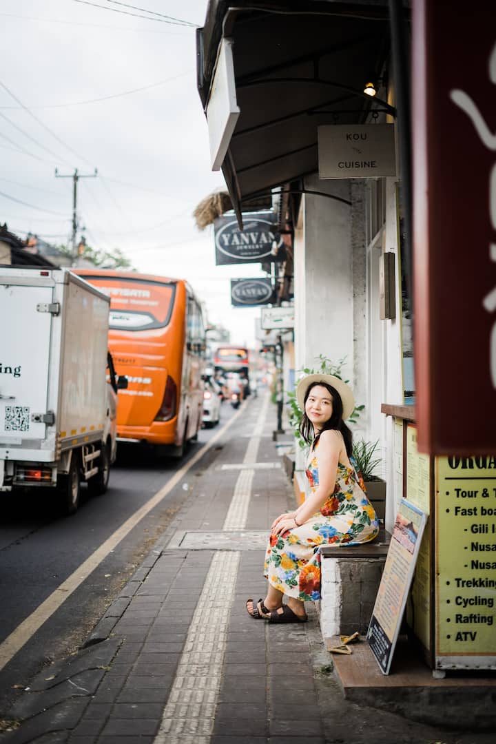 Bain sult as spaisteoireacht trí Ubud péireáilte le seisiún portráide, ag gabháil croílár an cheantair.