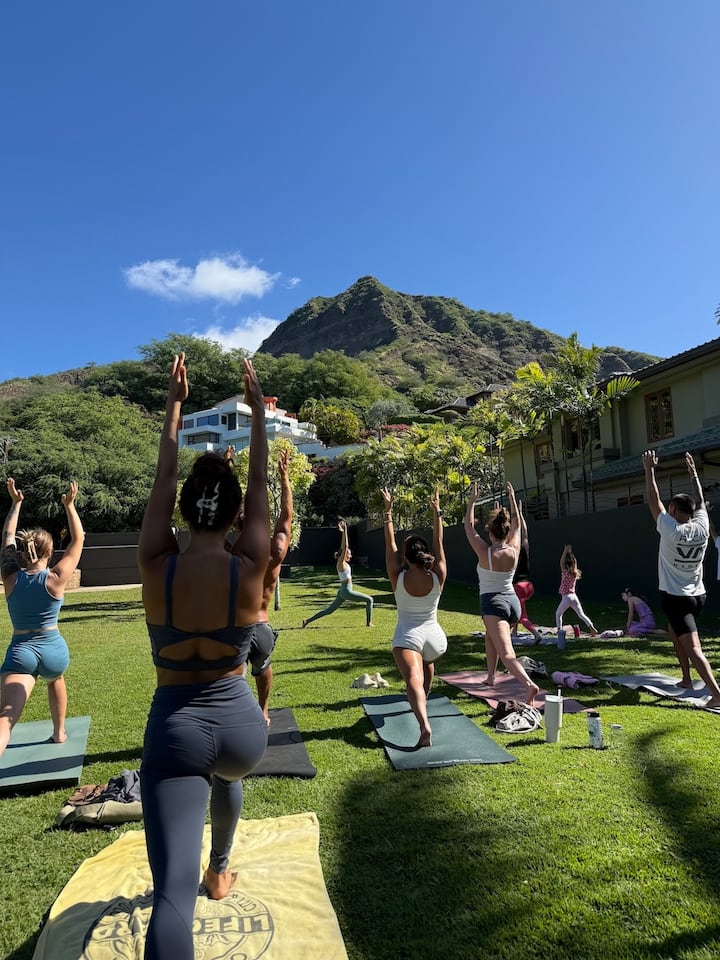 Bí liom le haghaidh rang ióga bunathraitheach le Diamond Head agus ag breathnú amach ar an aigéan.