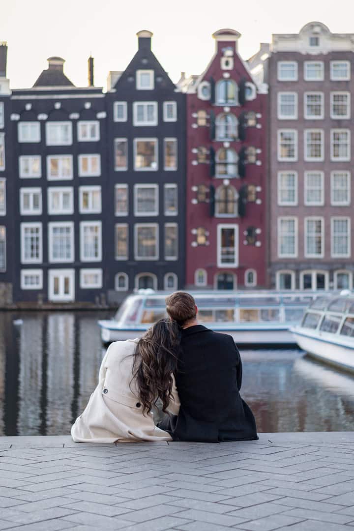 Déan ceiliúradh ar do nasc le dreas fótagrafaíochta suaimhneach do lánúineacha i gcroílár Amstardam. Buailfimid le chéile ag Damrak agus rachaimid ar shiúlóid álainn ar chanálacha, droichid agus sráideanna stairiúla atá lán de dhraíocht na hÍsiltíre. Treoróidh mé thú go réidh chun cuimhní nádúrtha pearsanta a ghabháil - gan strus ar bith, gan ach an bheirt agaibh ag baint sult as an gcathair le chéile agus mé ag cruthú portráidí gan dua i suíomhanna áille ailtireachta.