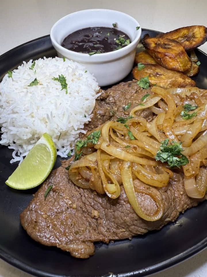 Tugann Clasaic Chúbach le chéile na blasanna a shainmhíníonn cócaireacht thraidisiúnta Chúba. Déantar an bistec de palomilla bog, atá clúdaithe le hoinniúin shóitéáilte, a shéasú agus a shéideadh go foirfe, ansin déantar é a riar le rís bán clúmhach, pónairí dubha blasta, agus maduros milis, carmalaithe. Tá an pláta compordach, blasta seo foirfe le roinnt agus freastalaíonn sé ar 6 dhuine ar a laghad, foirfe le haghaidh béile teaghlaigh nó cruinnithe beaga.