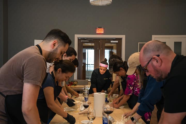Sa rang cócaireachta seo, déan agus bain sult as béile 3 chúrsa le sailéad, ravioli agus anlann úr, agus milseog, agus faigh naprún bróidnithe ó Tusha's Food mar chuimhneachán.