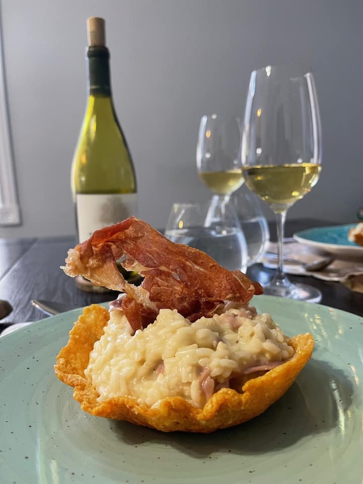 Aoibhneas i panzanella, lean an príomhrogha cúrsa risotto le ciseán Parmesan le prosciutto agus brie, cáis biatais agus gabhair, nó cupim (gearradh mairteola Brasaíleach) agus Parmesan, agus críochnaithe le tiramisu baile.