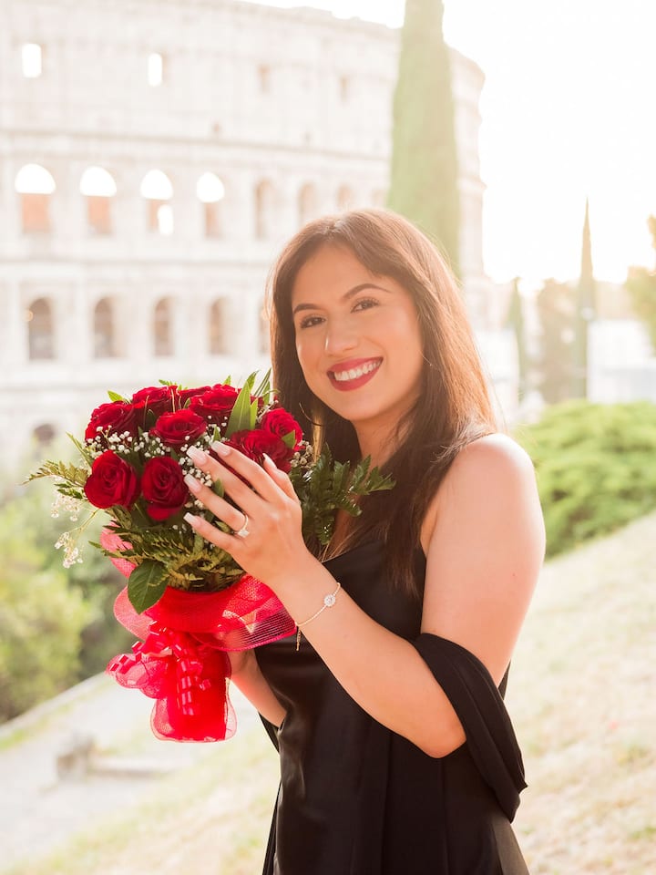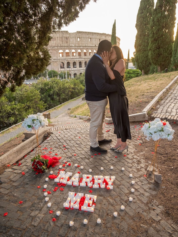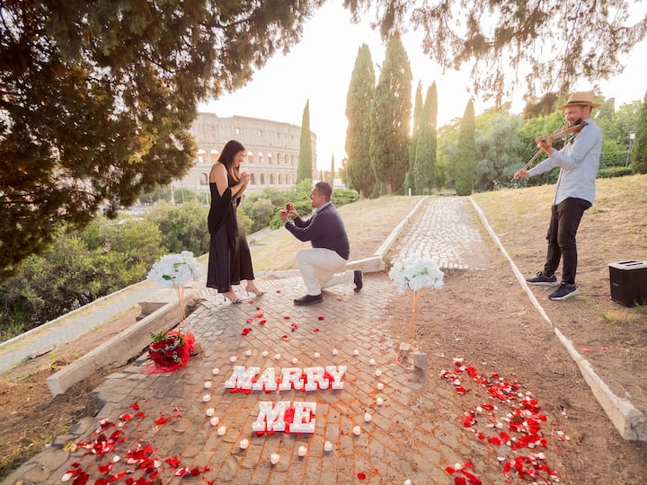 Dreas fótagrafaíochta 60 nóiméad sa Róimh le comhartha “Marry Me ”, bláthanna, coinnle, agus ceol veidhlín beo (amhráin de do rogha féin). Tá 2 shuíomh rómánsúla agus 50 grianghraf curtha in eagar san áireamh chun do nóiméad dodhearmadta a ghabháil.