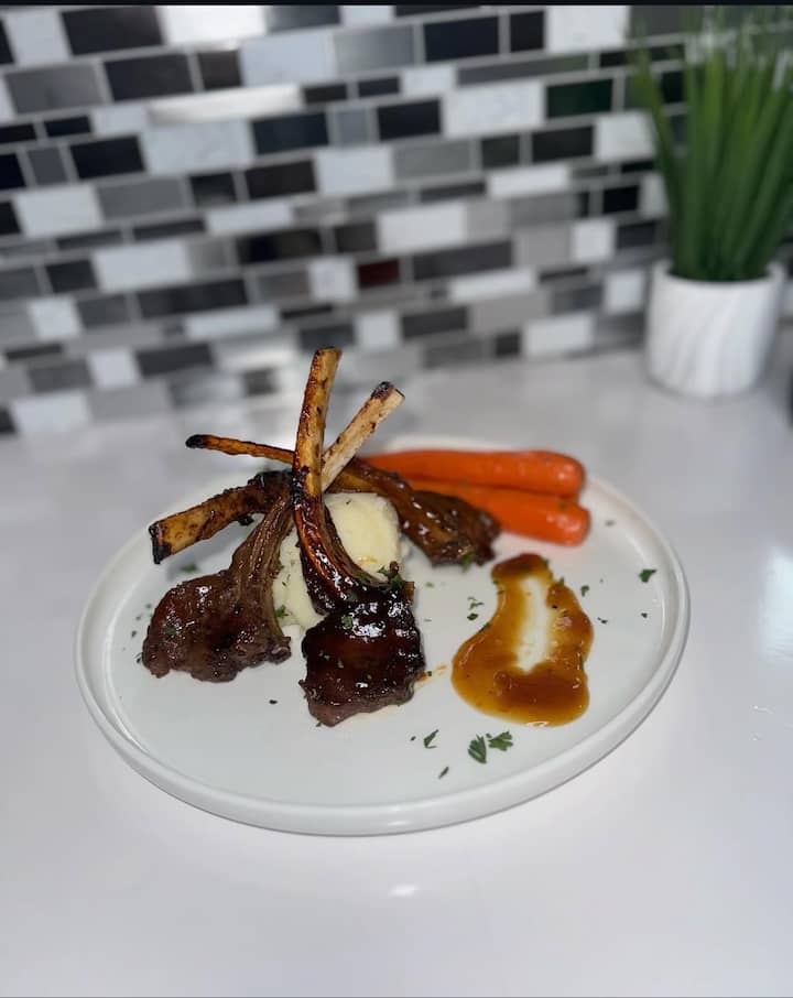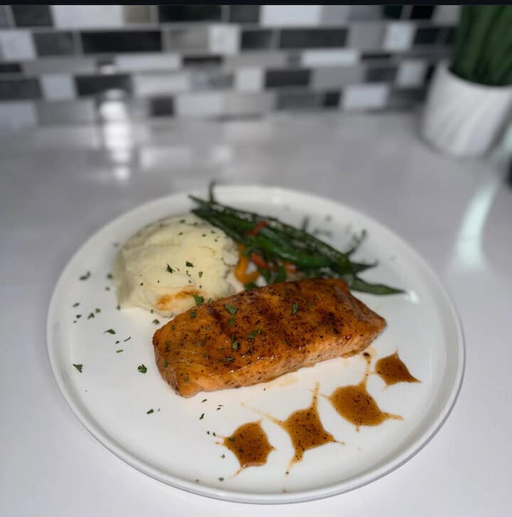 Cuimsíonn an féasta seo do 3 aoi nó níos mó sailéad séasúrach, bradán peanáilte, prátaí maisithe strufail, agus milseog.