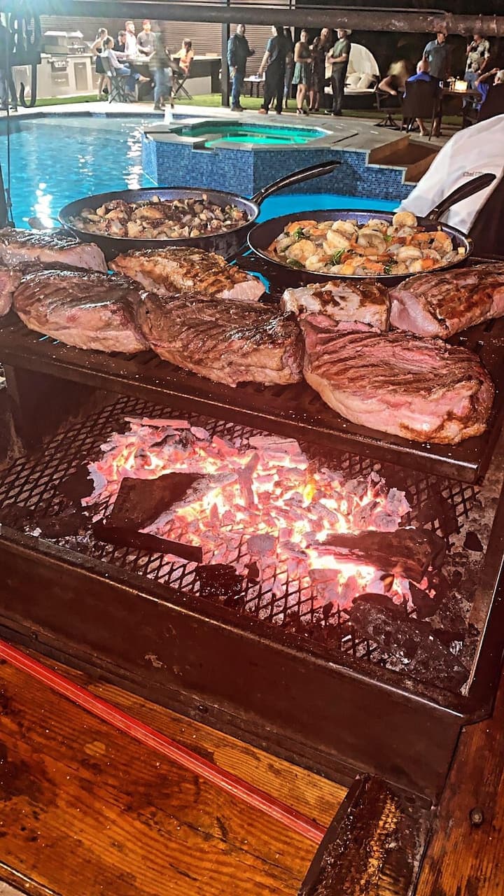 Tabharfaimid eispéireas cúig réalta Steakhouse chuig do chlós cúil lenár réamhbhéilí iontacha bia mara agus feolta USDA Prime. Greadóga: Chorizos na hAirgintíne, ribí móra gairleoige ollmhóra agus Sailéad Caprese. Príomhbhéile: Sicín BBQ Meala, Stéig Sciorta den Scoth USDA & Ribeye den Scoth USDA Le Prátaí Beaga Gairleoige agus Sailéad Tí. Déanaimid ár gcuid feolta a ghríoscadh ar ghualach agus ar adhmad lenár ngríoscáin féin a thugaimid chuig do shuíomh.