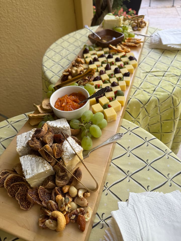 Tábla féasta spraíúil. Go leor éagsúlachta, cáiseanna, pictealáin agus subha tí, feolta leathchócaráilte, cnónna spíosraithe, torthaí triomaithe, ológa, caora, craicir, arán áitiúil, glasraí, diopaí, sneaiceanna milse, seacláid, milseáin, mionchístíní.