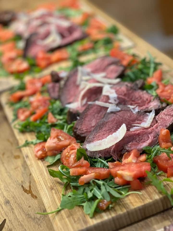 Bain sult as eispéireas iomlán beárbaiciú le réimse mearscairteanna lena n-áirítear Bruschetta Italiana, Mionleatháin, Sailéad Caprese, agus Fritíní Cúrgeite. Agus ina dhiaidh sin, Bróit Mhara éadrom i bhfíon bán agus tim, easnacha boga in anlann BBQ spíosrach, agus cáis chíche fanaile clasaiceach bácáilte mar chríoch.