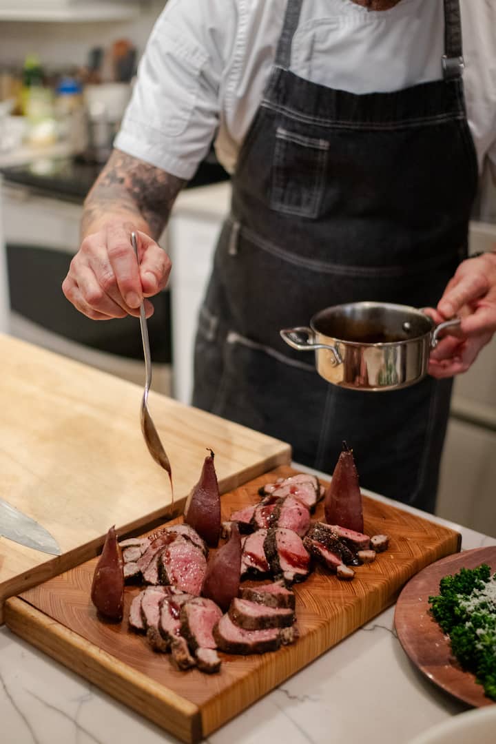 Iomlán uaine uain arna róstadh, prátaí óir Yukon, Bok Choy, piorraí póitseáilte le fíon, Demi fíon dearg