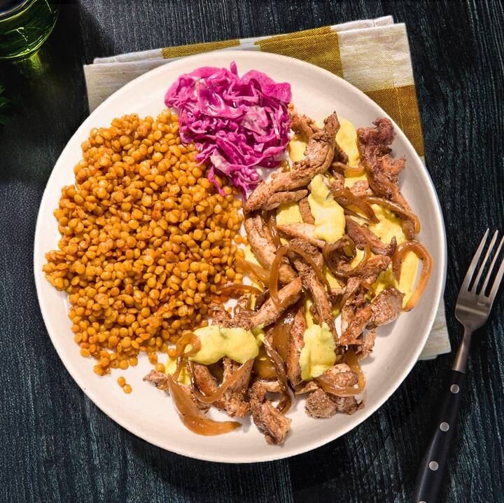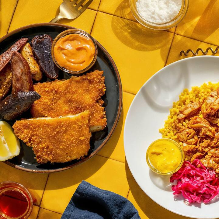 4 bhéile. Cuir dhá cheann de na mias is mó éilimh le chéile—Cearc Shawarma an Mheánoirthir (cearc shawarma-spíosraithe agus cúscús Iosraelach le cabáiste milis picilte agus aioli Amba géar), Sicín le Prátaí Za'atar (gearrthach sicín panko briosc, prátaí spíosraithe, agus splancán de aioli harissa).