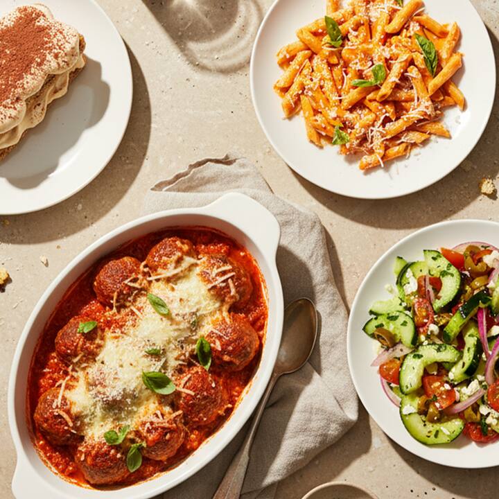 4 Bhéile + 2 Thaobhbhia + 2 Mhilseog. Bia bunúsach inroinnte a mbeidh tú ag iarraidh an dara babhta de— Penne a la Vodka (anlann uachtarach iontach simplí le basil agus Grana Padano), Mom's Meatballs (marinara baile, le splancán de ispín spíosrach) An Sailéad Taobh Gréagach (glasraí úra, ológa glasa, agus cáis feta mhionaithe), Tiramisu Uachtarach Kahlua (buailíní boga, mascarpone mín, agus splancán de phúdar cócó). Tá 2 cheann de gach earra san áireamh.