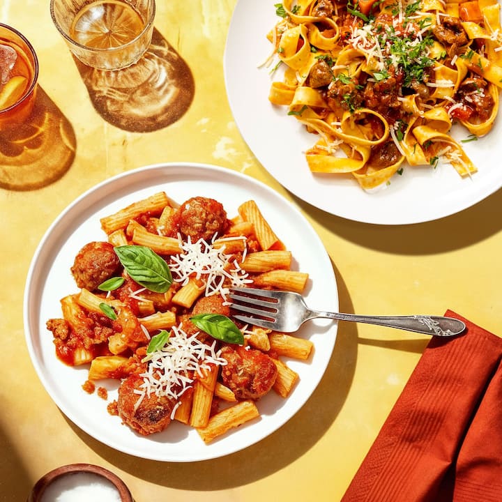 4 bhéile. Tá sólás cluthar i ndán duit—Rigatoni Dé Domhnaigh Mamaí (anlann traidisiúnta barántúil Dé Domhnaigh díreach mar a dhéanfadh seanmháthair le liathróidí feola boga blasta, marinara barántúil géar agus ispíní muiceola Iodálacha spíosracha), Pappardelle le Ragu Muiceola (gualainn muiceola shaibhir, cócaráilte go mall go dtí go dtiteann sé as a chéile - tairisceana le trátaí, cairéid, oinniúin, agus soilire, ag cruthú anlann shaibhir agus láidir).Á riar thar núdail pappardelle leathana síodaí).