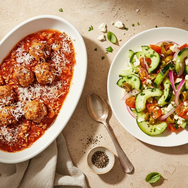 2 bhéile + 2 thaobhsailéad. Má theastaíonn rud éigin uait go tapa atá sáithiúil agus blasta, seo an beart duitse—Liathróidí Feola Mamma (marinara baile, le splancán de ispín spíosrach), An Sailéad Taobh Gréagach (glasraí úra, ológa glasa, agus cáis fhéita bhrúite). Tá 2 cheann de gach earra san áireamh.