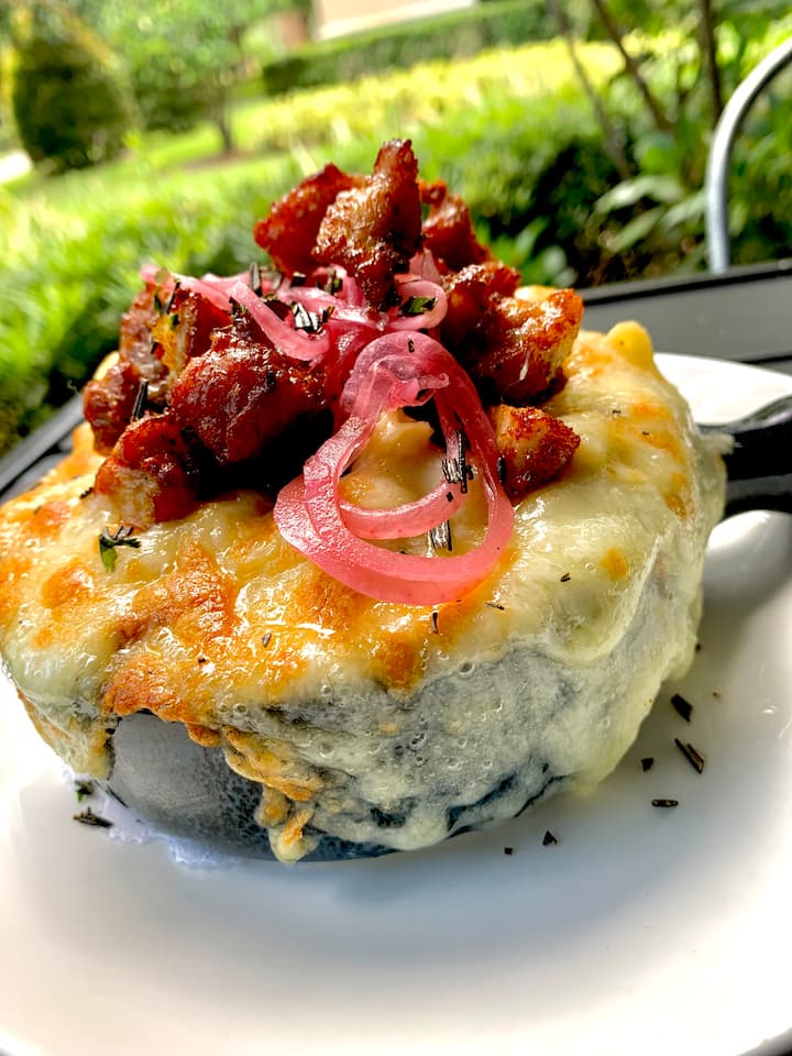 An dara cúrsa: Leathchearc Iarainn Teilgthe, prátaí buailte luibheanna, sprúis Bhruiséile le bagún agus rísíní, leathghlónra.