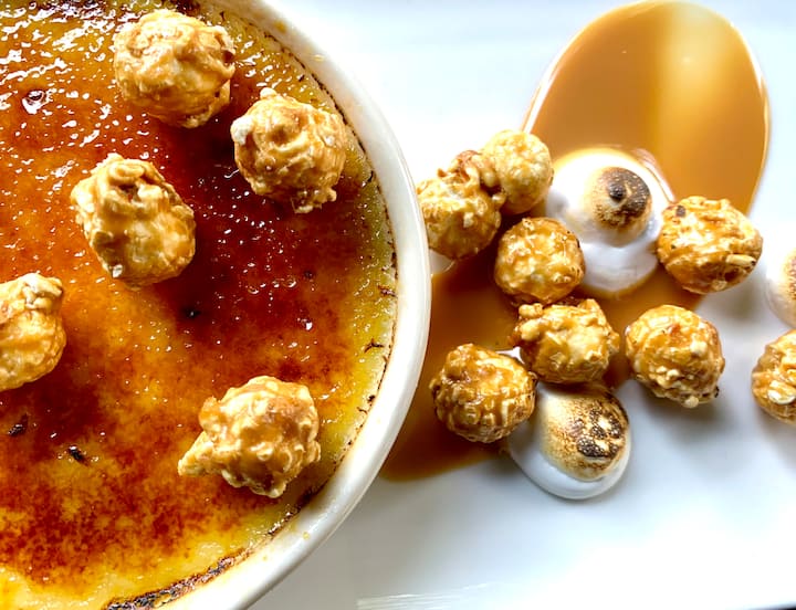 An tríú cúrsa: Crème Brûlée Popcorn Caramal.