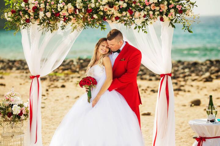 Fótaisheisiún cois farraige (nó ag do villa) le stuach bláthanna bainise agus searmanas beag siombalach.