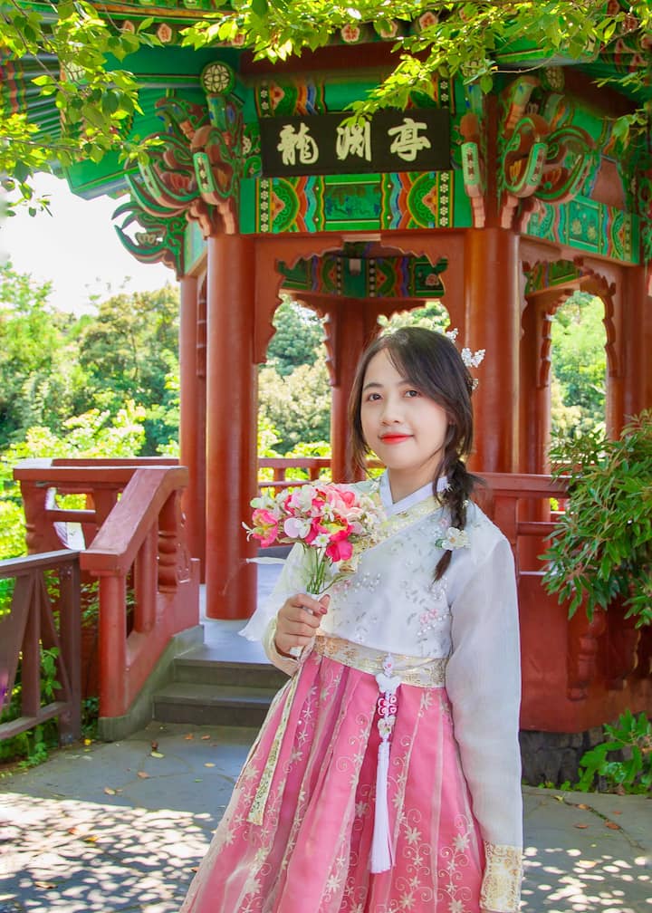 Eispéireas féinfhótagrafaíochta ag caitheamh hanbok sa chrios grianghraf faoi dhíon, atá oiriúnach do laethanta na coise tinne, don gheimhreadh agus do bhuaic an tsamhraidh.