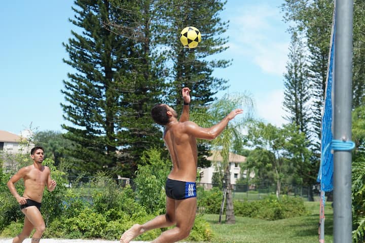 Idir thosaitheoirí agus ardleibhéal, foghlaim na bunrudaí agus feabhsaigh do scileanna i dtimpeallacht áthasach. Is meascán d'eitpheil agus de pheil chomhlachais é footvolley, a tháinig as tránna Rio de Janeiro ar dtús. Tá seisiúin ar fáil do gach leibhéal, rud a chinntíonn eispéireas spraíúil tarraingteach.