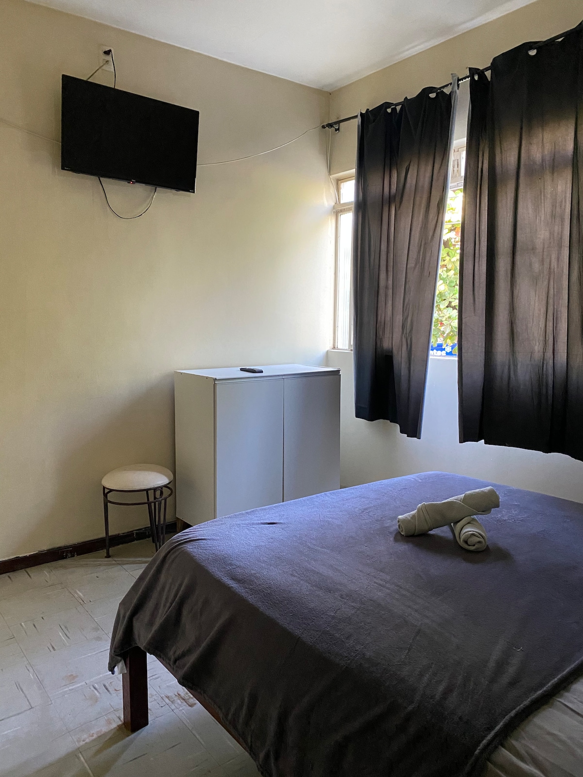 A acomodação é um quarto simples, ideal para quem busca praticidade e economia. Estamos localizados no centro da cidade, próximos a comércio, restaurantes, serviços e transporte. Importante: os quartos são de acordo com a disponibilidade. Para consultar opções com janela, solicite antes da reserva. O que oferecemos no quarto: • cama de casal • TV • ventilador • armário • roupa de cama • toalha