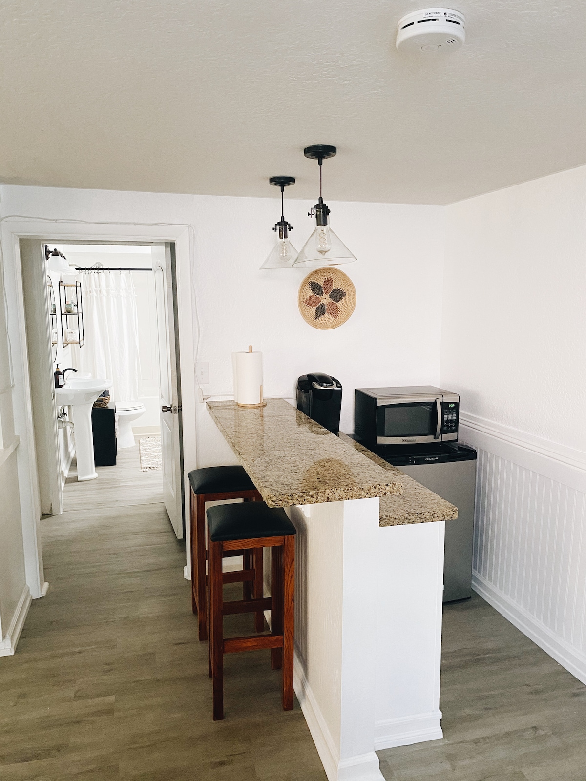 Svuít phríobháideach ina bhfuil dhá sheomra/aon seomra folctha amháin le bealach isteach príobháideach agus páirceáil (ar thaobh clé an chabhsa). Beidh príobháideacht iomlán agat gan aon spásanna comhroinnte. 10 nóiméad ó lár Redding. Leaba bhanríona i seomra mór agus leaba iomlán/dhúbailte i seomra beag. 75” Roku Smart TV, bia beag le 3 chathaoir, micreathonnán, mionchuisneoir (tabhair faoi deara, níl aon chistin ann), soláthairtí caife/tae, tóstaer, citeal, iarann, clár iarnála, agus triomadóir gruaige ar fáil.
