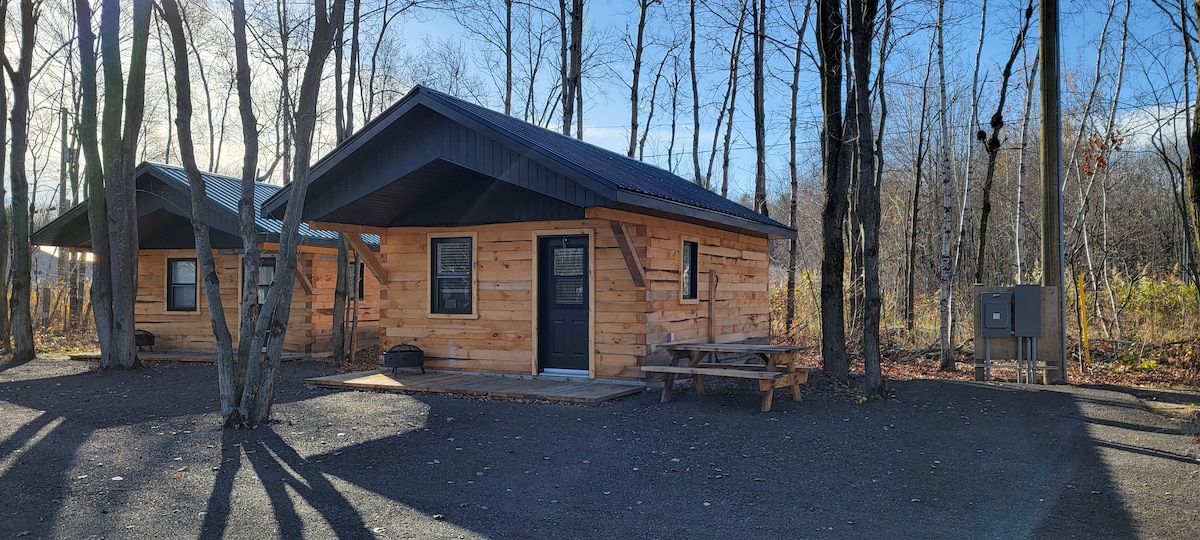 Magnifiques petits chalets en bois, vue sur la montagne , c'est un havre de paix. Amoureux de nature et de plein air vous serez choyés. Pour ceux qui ont besoin de ressourcer les chalets sont douillet et bien aménagés. Plusieurs commodités ( internet , air climatisé, foyer intérieur au bois, cuisine, spa ) . A noté que le spa et sauna sec sont partagés entre les unités du domaine. Accès à la rivières et sentier directement du chalet. Animaux interdir