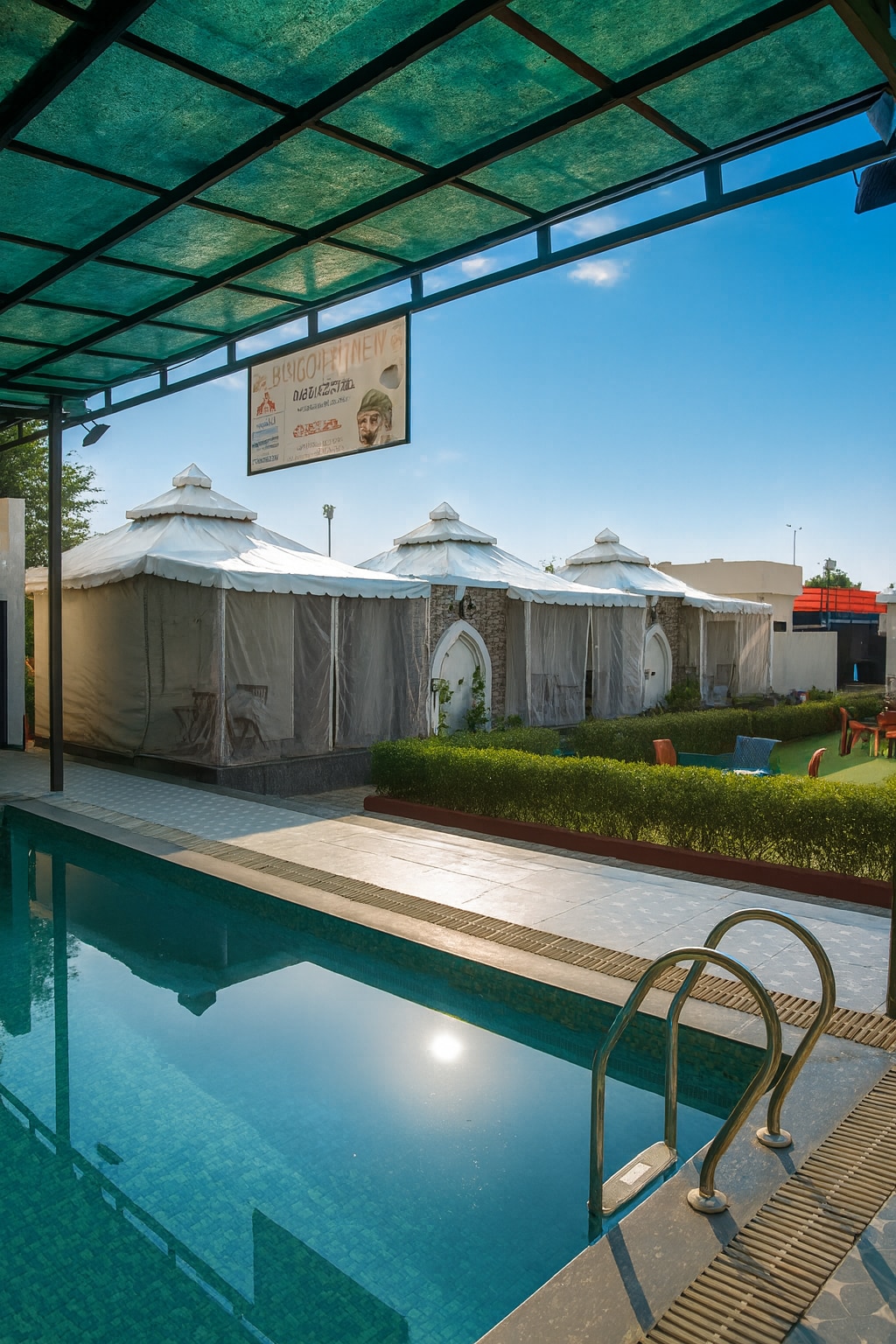 Experience comfort in our Luxury Cottage Tent, featuring spacious interiors, premium bedding, air-cooling, a private sit-out, and a modern washroom. Surrounded by nature, it's ideal for couples, families, and leisure travelers. Guests can also enjoy our swimming pool, rain dance, and peaceful garden area for a relaxing and refreshing stay. Key Features: Spacious cottage-style tent Premium king bedding Air-cooling/air-conditioning Private sit-out area Modern washroom with essential amenities