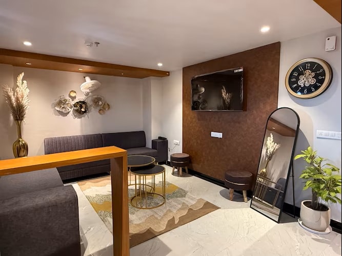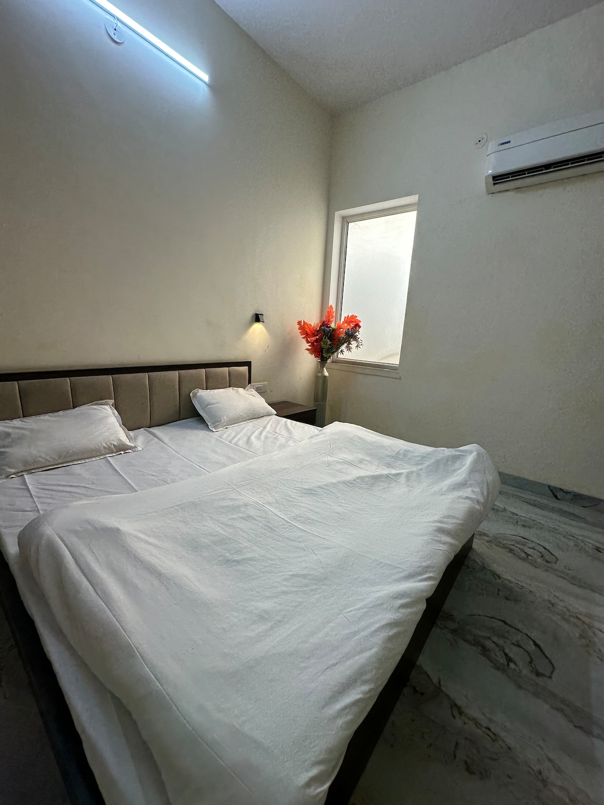 Please Check facility,🤗 1 43" Smart Tv 📺 2 High Speed internet ,🛜 3 one king size bed 🛌 4 A big size attached bathroom/Geyser🛀 5 A balcony space back side 🛋️ 6A Big size 3 seater sofa for relaxing💺 7A full equipped share kitchen with all utensils,🍲 8A big size lobby area near for sitting🧘♂️ 9 Hair dryer👶 10 iron facility🧺 11 Ro is installed for fresh water ,🍶 12 clean bedsheet and blanket,🧤 13Daily house keeping 14 Security camera are install for Safety/Car parking 📷 10 cars