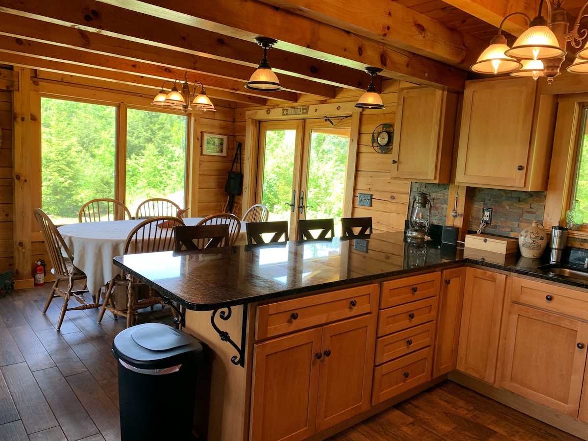 Cábán Álainn Log i suíomh príobháideach, ach níl sé ach 10 nóiméad le tiomáint chuig an mbaile. Amhairc Iontacha 180 Céim Sléibhe. Má tá tú ag lorg áit shuaimhneach shuaimhneach, seo é.. Tabhair leat do chuid slipéir ! • 5 nóiméad go dtí rochtain abhann Androscoggin, cadhcáil, tiúbmharcaíocht & iascaireacht eitleoige • 10 nóiméad go dtí Foraois Náisiúnta White Mt, Conair Appalachian, Bethel & Newry • 15 nóiméad go dtí an Domhnach Sciáil & Samhradh Gondola nó Mtiterranhm • 30 nóiméad go Mt Washington AutoRoute & Wildcat Mt • 40 nóiméad go Storyland nó Santa's Village