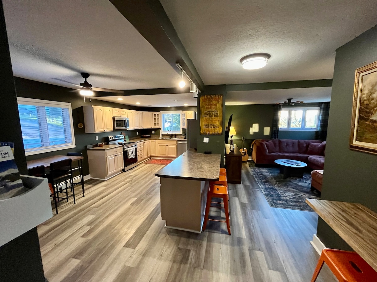 Ag glaoch ar gach díograiseoir lasmuigh agus iarrthóir eachtraíochta! Déan iniúchadh ar Thír álainn Thuaidh New Hampshire ónár dteach atá suite go háisiúil, athchóirithe i mBeirlín. Lonnaithe 1.5 míle ó Pháirc Stáit Shliabh Jericho, is é an bunchampa foirfe é do d'eachtra. ATV/UTV díreach ón teach, nó lean do mhóibílí sneachta díreach síos an bóthar. Tar éis do lá spraoi, téigh siar chun do scíth a ligean agus scíth a ligean, roinnt cluichí a imirt, béile a ullmhú, nó suí cois an phoill dóiteáin agus go simplí ar maos san atmaisféar.