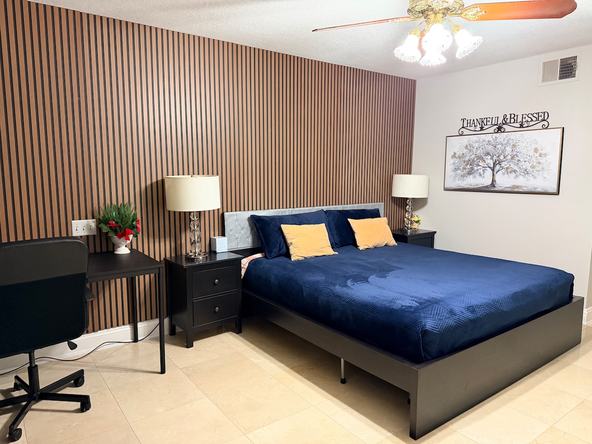 Stiúideo príobháideach atá foirfe do dhuine ar bith a thugann cuairt ar Orlando. Níl sé ach 10 nóiméad go dtí an tIonad Comhdhála, 5 nóiméad go dtí Óstán Ritz Carlton Grande Lakes, 12 nóiméad go dtí an t-aerfort, 20 nóiméad go dtí páirceanna téama agus in aice le I-drive, 528 agus 417. Wi-Fi tapa. Bain sult as meaisín níocháin agus triomadóir san aonad, leaba bhanríona chompordach ar a bhfuil tocht ardchaighdeáin, cistinéad, bealach isteach príobháideach agus aerchóiriú lárnach agus gaothrán chun an teocht a choinneáil foirfe ar fud an spáis. Spás páirceála saor in aisce. Tá an áit seo oiriúnach don obair nó don súgradh!