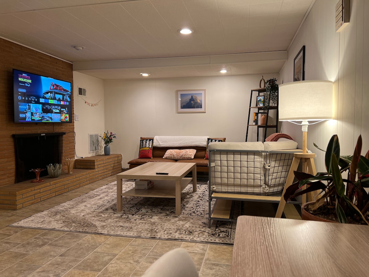 Fáilte go dtí do theach ar shiúl ón mbaile! Beidh an svuít iomlán d'aíonna agat duit féin. Tá sé suite ar leibhéal níos ísle ár dteach le bealach isteach príobháideach trínár gcúlchlós álainn. Bain sult as na seónna is fearr leat sa seomra amharclainne agus sa chistinéad atá feistithe le pláta te, micreathonnán agus minifridge. Ní raibh againn ach ár gceann beag anuraidh. Cé go ndéanaimid ár ndícheall an tsíocháin a choinneáil, b'fhéidir go gcloisfeá fuaimeanna áthasacha giggles linbh nó cosa boga anois agus arís i rith an lae.
