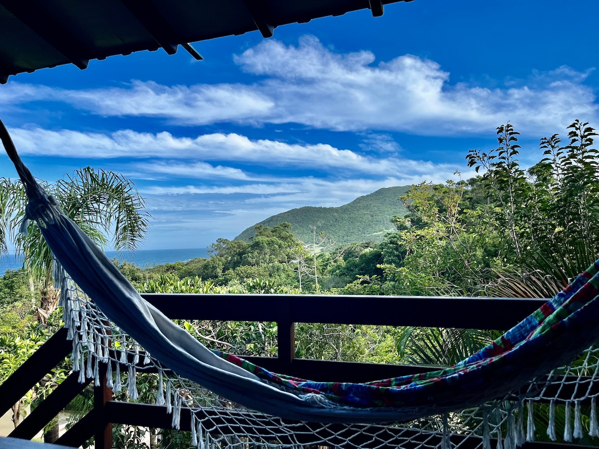 Stiúideo rómánsúil do lánúin ina bhfuil leaba bhanríona, tobán te, cithfholcadán gáis, cistin iomlán (sorn ionduchtaithe 2 dhóire, cuisneoir déphléacsach, oigheann agus uirlisí), aerchóiriú, teilifís chliste 43", balcóin mhór, agus teallach, le radharc dochreidte ar an bhforaois agus ar an aigéan ar thrá Silveira in Garopaba. Tá scáileán ar gach oscailt, ag soláthar timpeallacht atá aeráilte go maith agus saor ó fheithidí. É seo go léir ar phlota 2,000 m2, áit a bhfuil 3 stiúideo eile agus teach suite.
