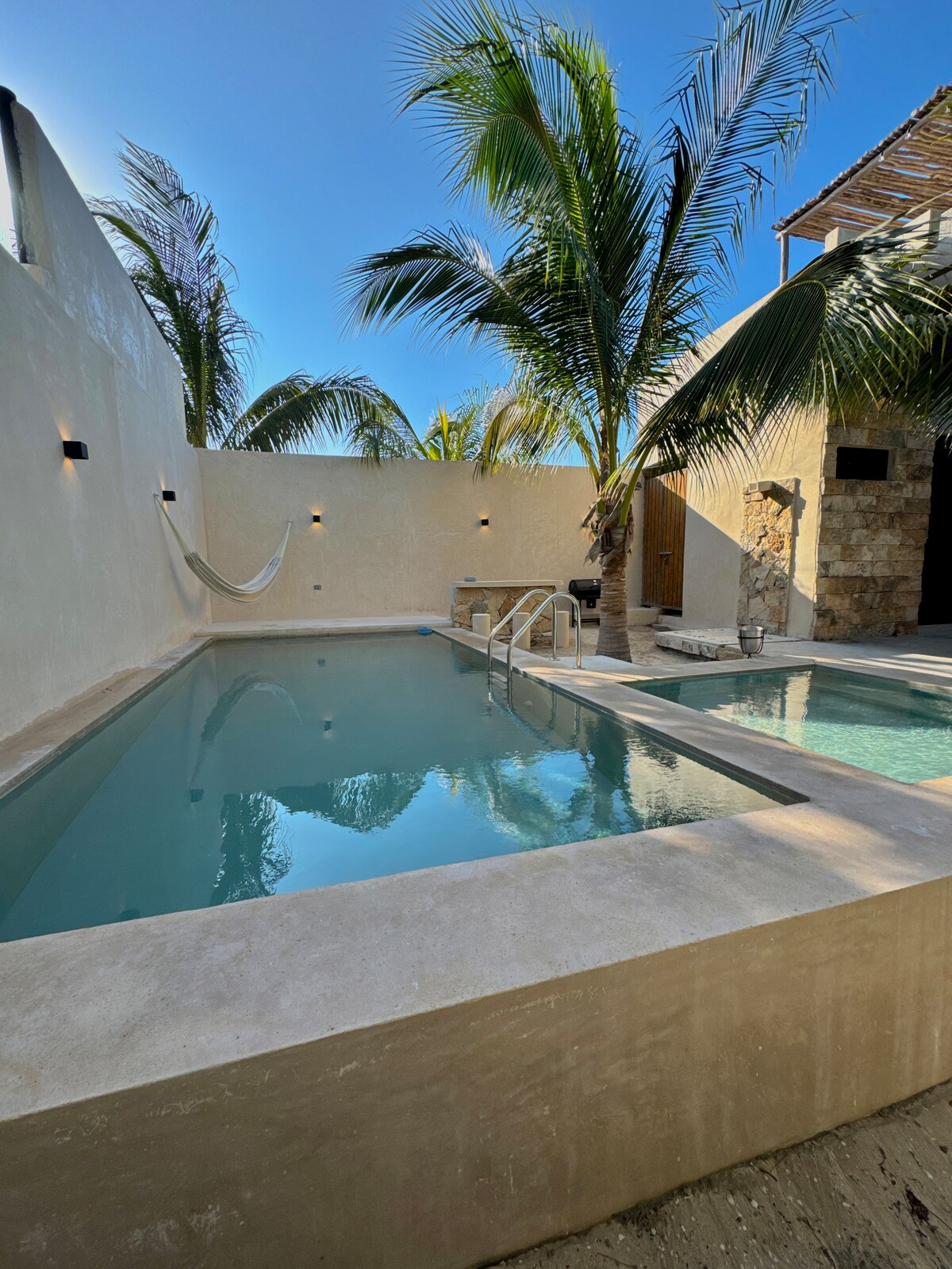 Casa María is a private home with a private pool, ideal for those seeking rest and privacy in a peaceful setting, with no shared spaces. Located 3 blocks from the beach in Telchac Puerto and close to the town center, restaurants, and beach clubs. It features a pool, bar, grill area, hammock, outdoor shower, rooftop with ocean view, bedroom, equipped kitchen, and full bathroom. A peaceful space to enjoy Telchac at your own pace.