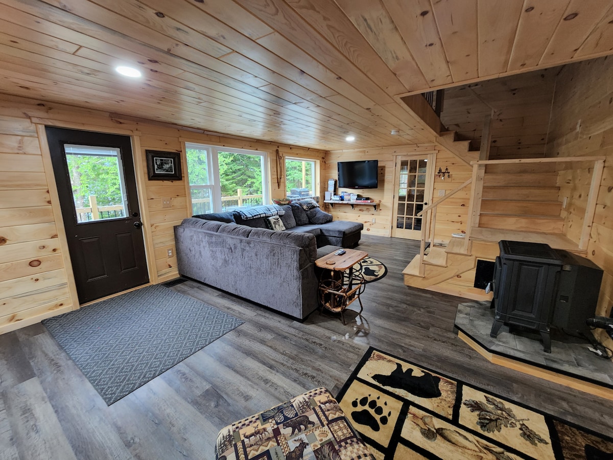 Níl sa chábán gleoite seo ach an méid a theastaíonn uait le haghaidh saoire ghearr! Le teanga agus groove pine ar fud, tá an cábán cluthar agus compordach. Is cábán lán - gheimhridh é seo, foirfe do gach díograiseoirí snowmobile! Tá go leor páirceála ann do leantóirí móibíleacha sneachta agus tá rochtain dhíreach ag an gcábán ar chosáin shneachta agus ATV. An bhfuil sé beartaithe agat a bheith anseo i rith an tsamhraidh? Tá rochtain ar an loch trasna na sráide. An bhfuil bád agat? Tabhair leat é - cuirimid spás duga saor in aisce ar fáil!