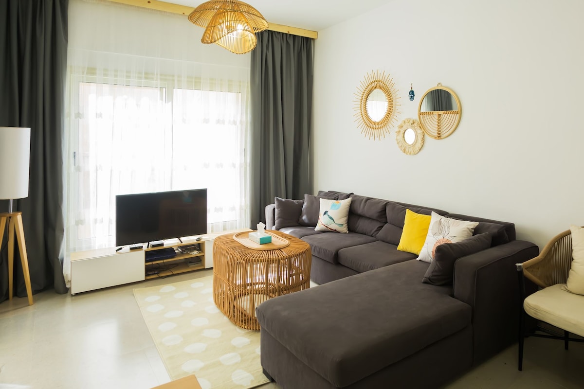 Bain sult as fanacht uathúil inár n - árasán galánta ar urlár na talún ina bhfuil radharc iontach ar an ngairdín agus ar an linn snámha. Tá seomra leapa compordach agus seomra suí fairsing ina bhfuil cistin oscailte san árasán, chomh maith le seomra folctha galánta agus ardán mór a ligeann duit do scíth a ligean in atmaisféar ciúin. An rud a dhéanann idirdhealú idir ár n - áit chónaithe agus a shuíomh uathúil laistigh de choimpléasc ciúin cónaithe, áit a bhfuil rochtain éasca agat ar mheall (Meall) nach bhfuil ach 20 céim ón árasán, ina bhfuil bialanna agus caiféanna éagsúla. Chomh maith leis sin, níl an áit ach 10 nóiméad ar shiúl ón aerfort, rud a fhágann go bhfuil sé oiriúnach do thaistealaithe atá ag lorg compoird.
