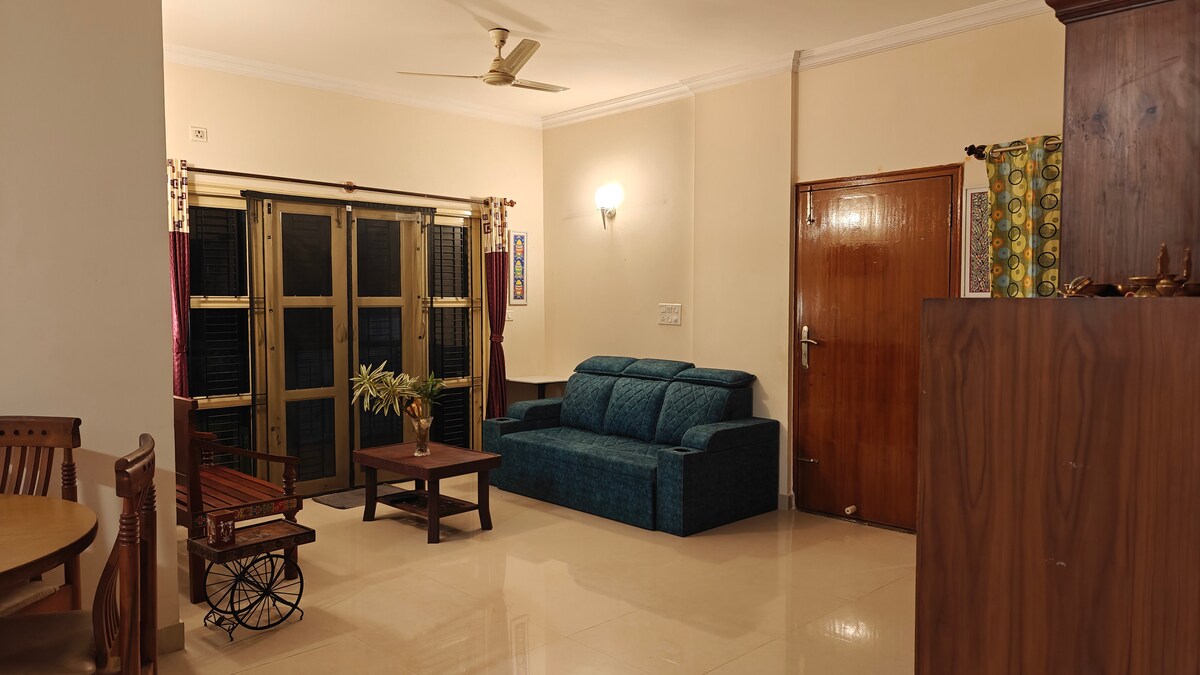 Is 3BHK fairsing é Whispering Woods in Jalahalli atá ag breathnú amach ar Fhoraois Stáit Jarkabandi. Múscail canadh na n - éan agus fiú péacóga in amanna. Díreach 3 km ó BEL Circle, le rochtain éasca ar BIEC, Peenya, Yeshwantpur, Malleswaram, Orion mall, Iskcon, Manyata, agus an t - aerfort, tá sé foirfe do thaistealaithe gnó, expats, mic léinn, nó teaghlaigh. Bain sult as compord nua - aimseartha le radhairc shuaimhneacha foraoise - suaimhneach ach ceangailte go maith, rud a fhágann go bhfuil sé oiriúnach do thréimhsí fanachta gearra agus do thréimhsí fanachta fada araon.
