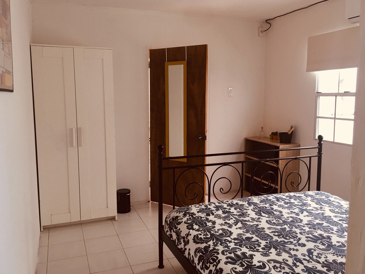 Taithí GAINEAMH BÁN GAIRDÍN TRÓPAICEACH ar bhealach uathúil. Téann bealach isteach príobháideach a théann trí ghairdín atá ildaite go trópaiceach chuig do sheomra leapa fairsing ina bhfuil seomra folctha príobháideach álainn athchóirithe. Tá leaba bhanríona chluthar, AC, mionchuisneoir, micreathonnán, déantóir caife, agus teilifíseán cothrom 50"i do sheomra a sholáthraíonn Netflix. Glac isteach radharc iontach 360 céim ar an rúidbhealach aerfoirt agus ar an aigéan ar an bpaitió ar an díon agus tú ag fáil tan nó ag baint sult as luí na gréine áille.