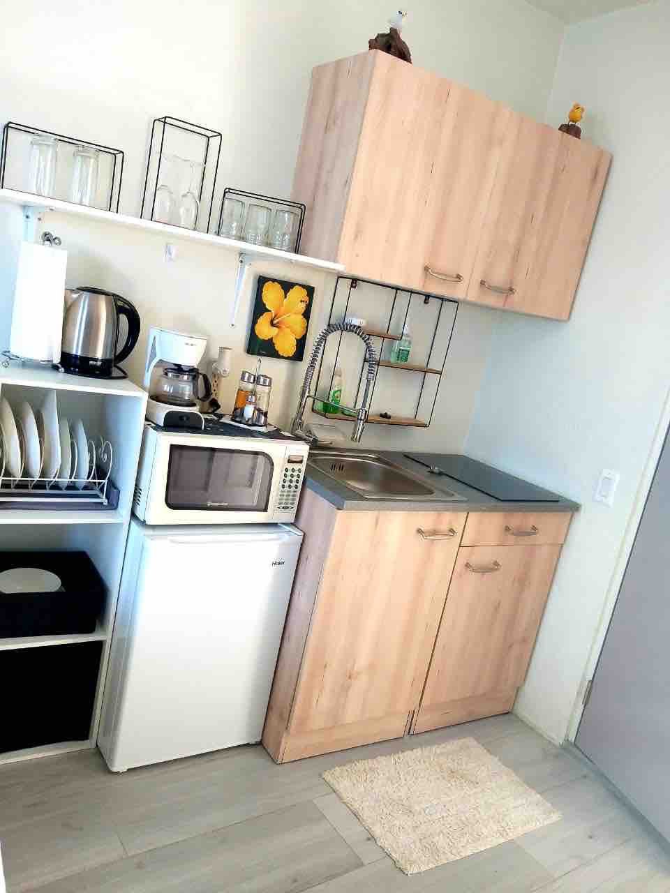 Árasán príobháideach le bealach isteach príobháideach in aice lenár bpríomhtheach, ina bhfuil seomra leapa aerchóirithe, seomra folctha príobháideach agus cistinéad ina bhfuil pláta teasa le haghaidh cócaireachta bunúsaí. Leaba bhanríona mhór chompordach (160 cm/63 orlach). Suíomh áisiúil: níl sé ach sráid amháin ó Thrá álainn Simpson Bay agus ó na beáir/bialanna bríomhara ar an trá. Tá an siopa grósaera céim ar shiúl agus tá bácús na Fraince laistigh d'achar siúil. Tá go leor gníomhaíochtaí in aice láimhe amhail sléibhte le haghaidh fánaíochta, muiríní sómasacha agus siamsaíocht oíche.