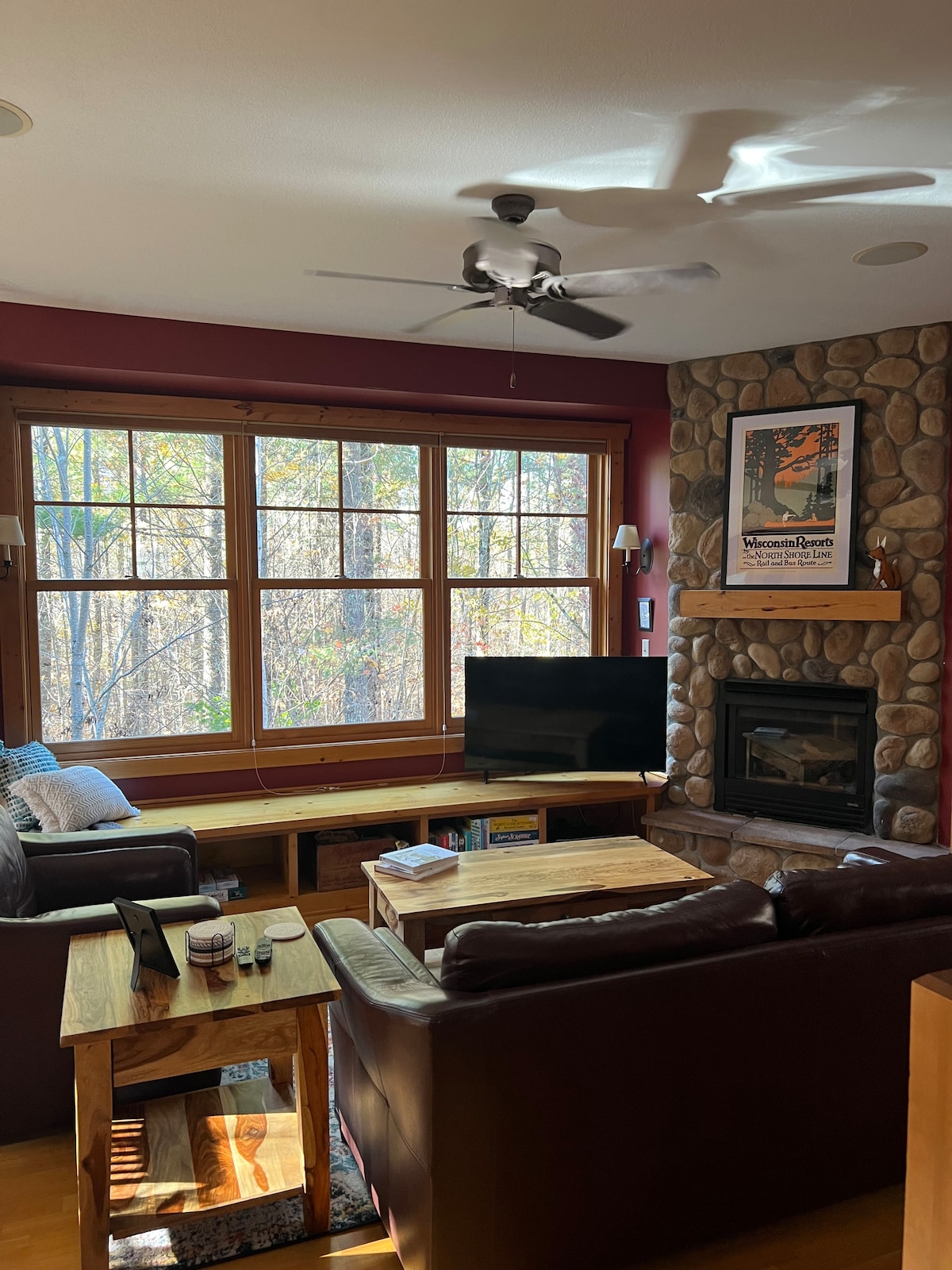 Cianrialtán, suaimhneach, ciúin agus níos mó ná saoire ghearr phríobháideach ar bhruacha abhann faoi chosaint, gan ach 1.5 uair an chloig ó na Twin Cities! Fiú an tiomáint álainn tá scíth a ligean. Cuir isteach domhan suaimhnis agus socair sa choill. Déan béilí blasta i gcistin ardleibhéil nua - aimseartha atá stocáilte go maith, súgradh san abhainn, lig do scíth sa sa sabhna nó bain sult as tine chnámh. Ní hé seo do chábán tipiciúil ach tá sé ina éiceabhách spioradálta le meascán uathúil eicléictiúil de aeistéitic nua - aimseartha, tíriúil, Mheiriceánach agus Sheapánach.
